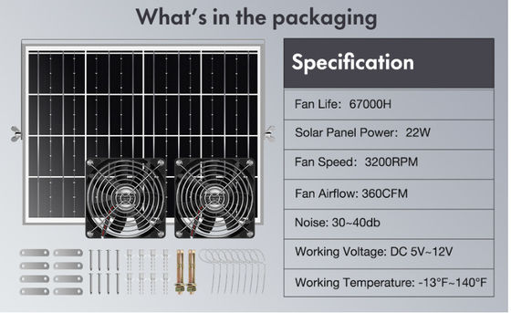 FTBM22 فن خورشیدی، کیت فن خورشیدی با پنل خورشیدی 22 وات IP67 ضد آببرای استفاده در خارج از خانه، مرغخانه ها، گلخانه ها، گودال ها، خانه های حیوانات خانگی، استفاده خانگی
